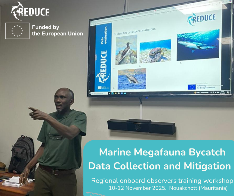 This workshop was organized by REDUCE project in collaboration with BirdLife International (BLI), the Partenariat Régional pour la Conservation de la zone côtière et Marine (PRCM) and the Institut Mauritanien de Recherches Océanographiques et des Pêches (IMRO) aimed at regional onboard observers. Participants acquired updated knowledge on bycatch of sea turtles, seabirds, elasmobranchs (sharks and rays) and marine mammals, biology, ecology and species identification of these taxa, standardizing bycatch data collection protocols, mitigation techniques and best practices for safe handling & release of bycatch specimens (sea turtles, seabirds, sharks & rays and marine mammals),